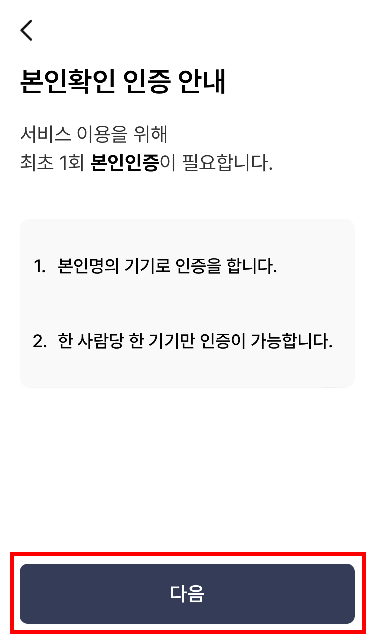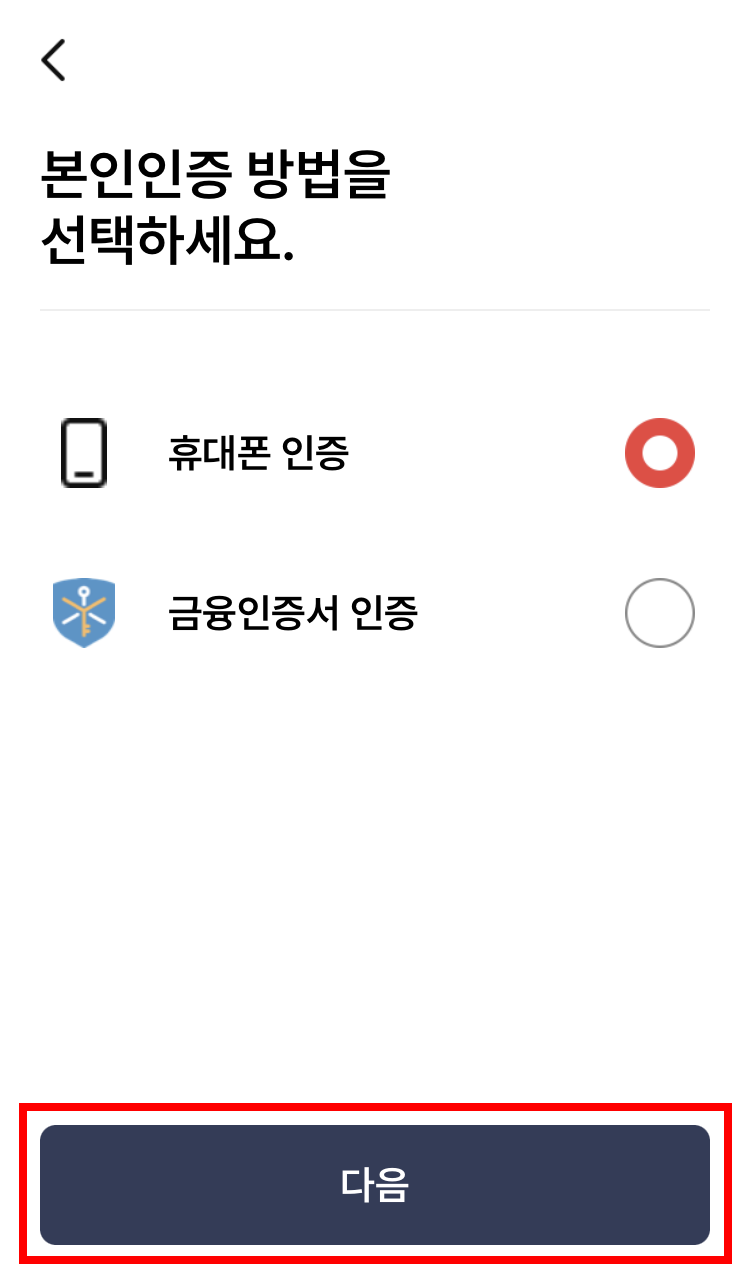 5. 본인확인을 위한 인증을 위해 휴대폰 인증을 선택하고 다음을 눌러 인증절차를 진행합니다.