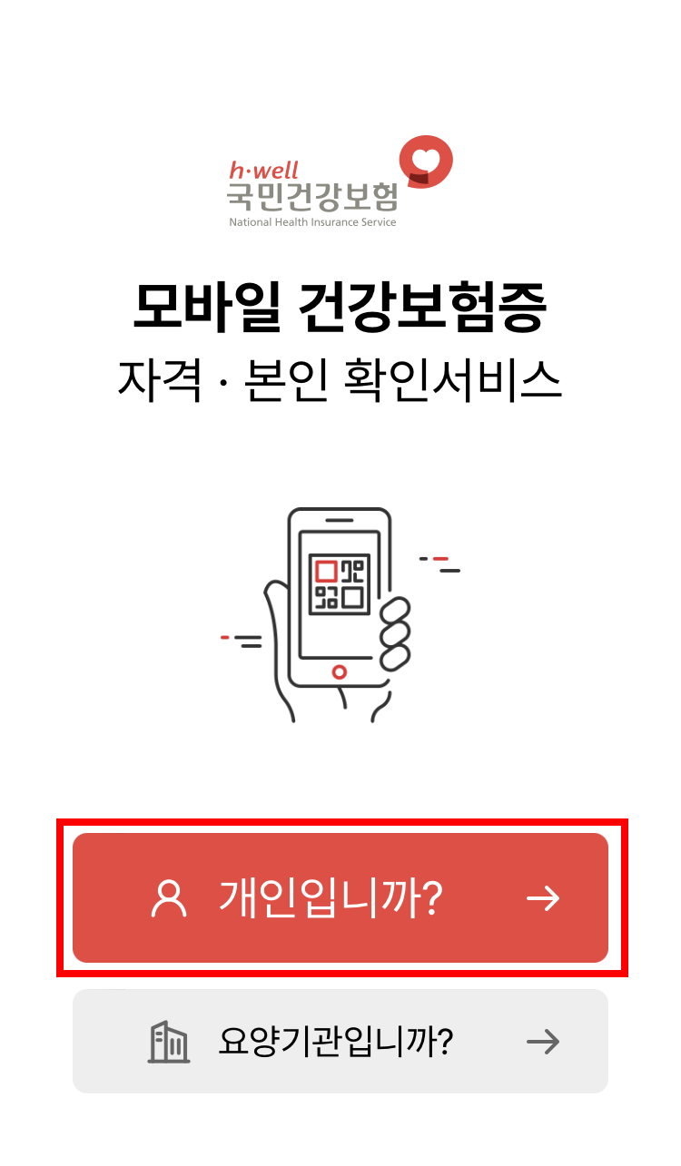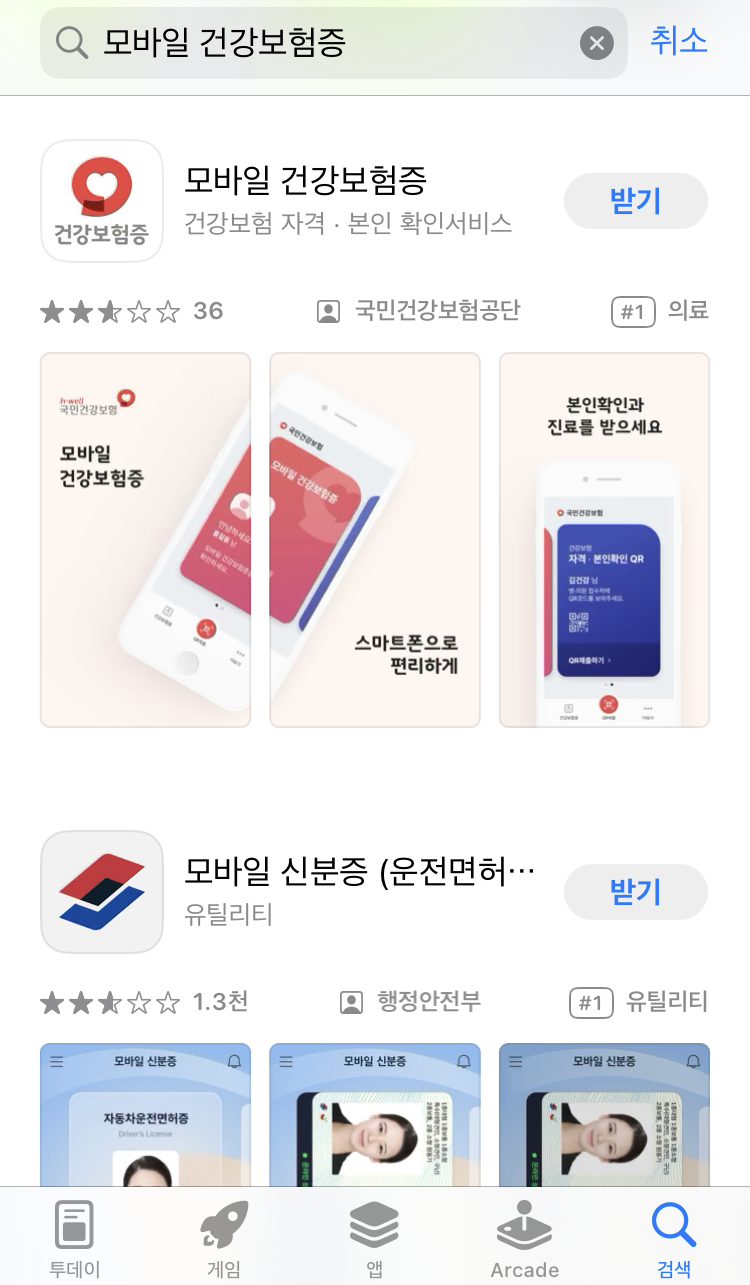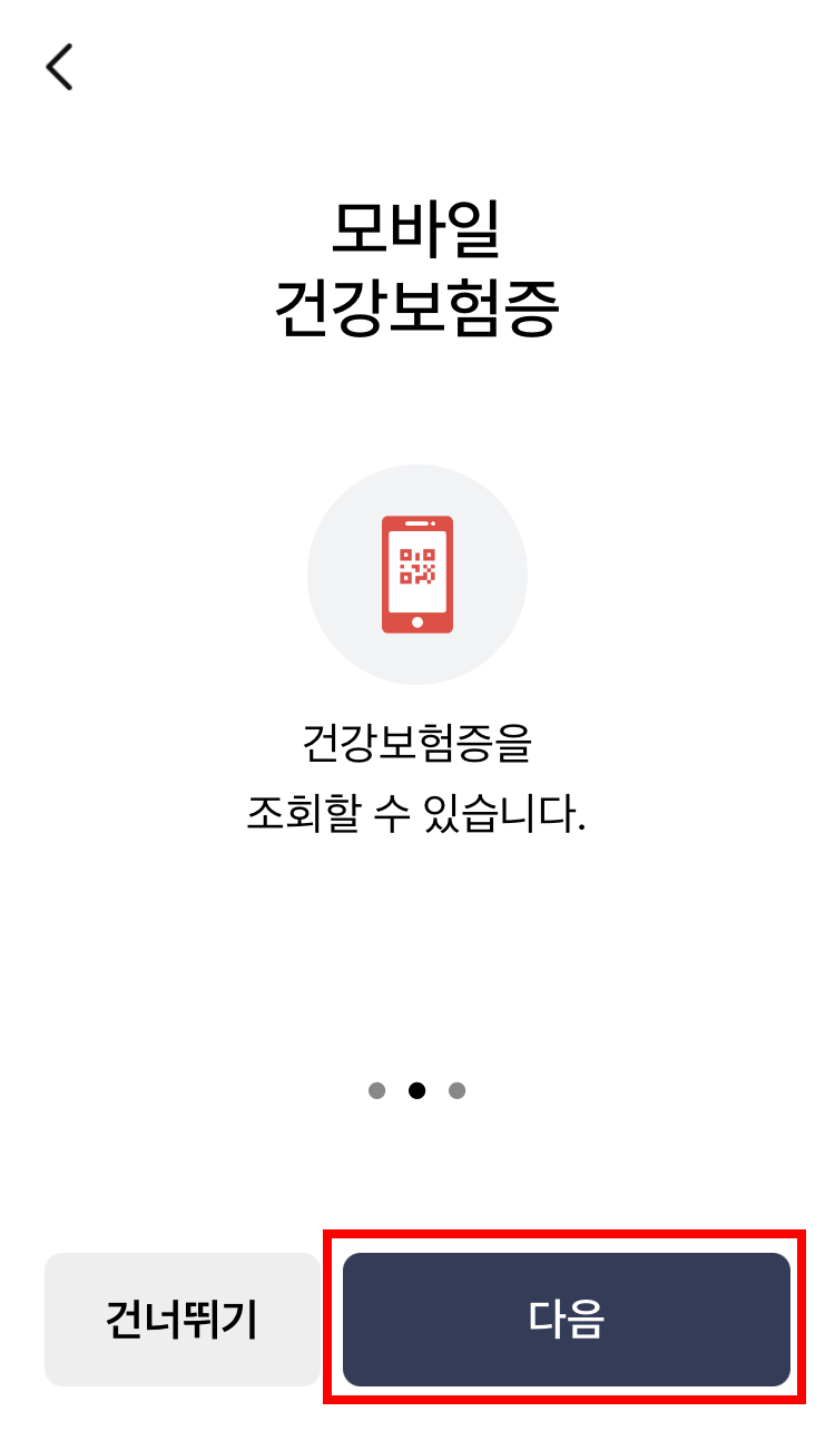 1. Play스토어 또는 App스토어에서 "모바일 건강보험증"을 다운로드하고 실행시킵니다.