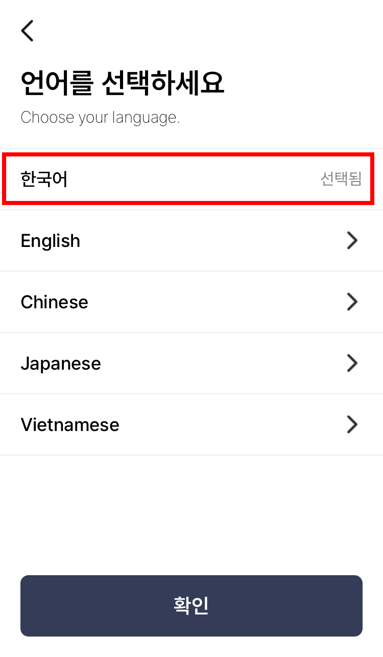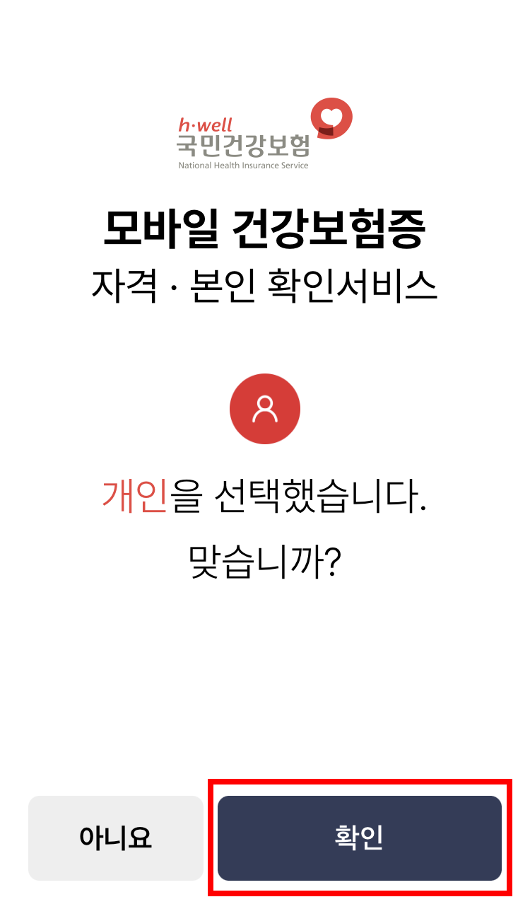 2. 개인이면 개인, 요양기관이면 요양기관을 선택 후 확인, 한국어 선택 후 확인을 눌러줍니다.